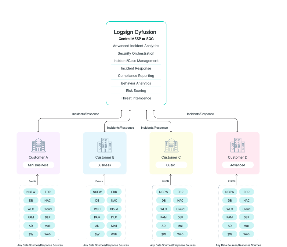 Welcome to the future of security incident management. Logsign Cyfusion is a multitenant (on-prem and SaaS) platform designed specifically for managed security service providers (MSSPs). With its centralized hub, real-time monitoring capabilities, and advanced analysis tools, Logsign Cyfusion empowers MSSPs to centrally manage incident detection and response across their entire customer base and proactively detect, investigate, and respond right on time, ensuring the highest level of protection for their customers while offering them a set of features that lighten the security teams’ workload.